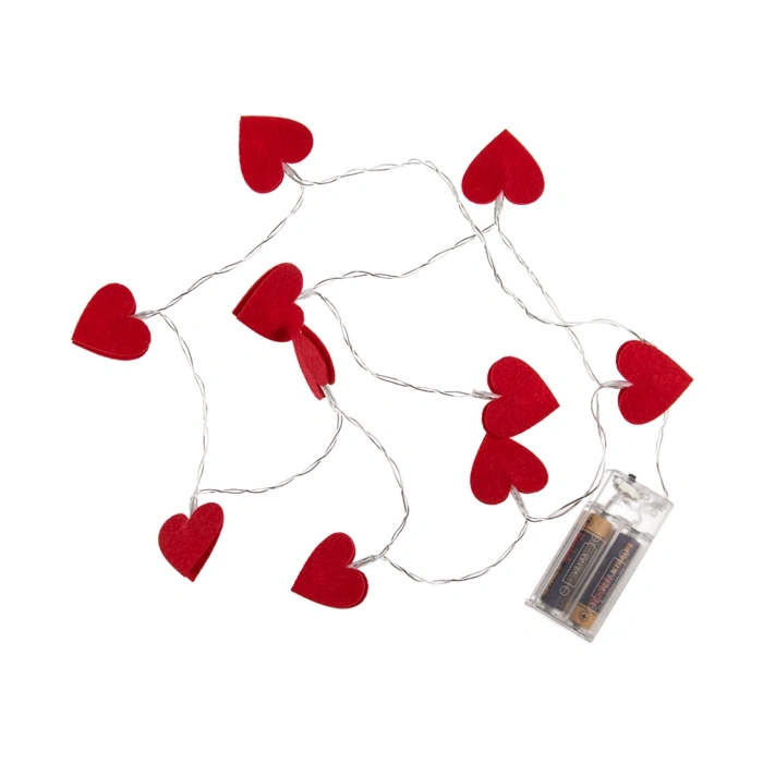 Impodobeste-ti dormitorul si aprinde scanteia iubirii cu aceasta instalatie romantica cu lungimea de 1,2 metri.Prevazuta cu 10 LED-uri ce elibereaza o lumina calda si cu inimioarele rosu intens din material textil, aceasta instalatie este conectata la o telecomanda cu buton de on/off ce functioneaza cu 2 baterii AAA, neincluse.